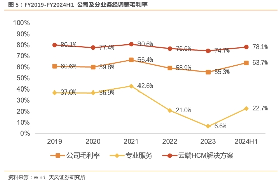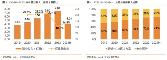 公司收入稳健增长,FY2019-FY2023订阅收入CAGR高达26.6%。FY2019-FY2023公司收入由3.82亿元增长至7.51亿元,FY2024H1收入达4.01亿元,同比增长14.2%,主要系公司云端HCM解决方案订阅收入增加所推动,云端HCM解决方案收入贡献了绝大多数增长, FY2019-FY2024H1占比由55%增长至74%,增长了19pct。