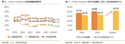 员工年均薪酬呈上升趋势,FY2023员工人效稳定,FY2024财年人效有望实现突破。FY2023员工年均薪酬为40.96万元,同比增长9.1%;2024 H1员工年均劳动生产力为42.16万元(我们根据H1的数据推算),FY2022、2023分别为32.30、32.73万元,主要系公司员工总数自FY2023-FY2024H1 由2295人减少至1901人,同时收入维持稳步增长导致,人效已经看到突破。