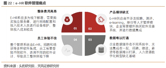据头豹研究院的研究表明,本地部署的e-HR存在整体费用高昂、产品模块缺乏、数据难以打通、员工体验不佳的难题。e-HR需要企业购买额外物理配置和进行后期维护等工作,导致整体成本投入过高,此外,软件为一次性付费模式,企业资金压力较大。人才管理模块需要企业额外购入软件完善系统,并进行数据集成,不同软件导致数据储存分散,数据打通困难,多软件系统也导致员工操作不便,体验感下降。