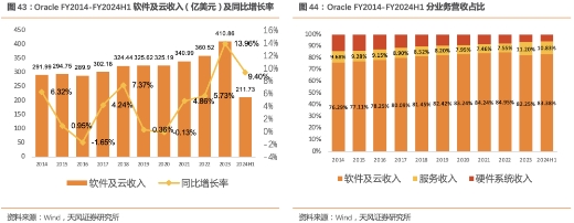软件及云收入及占比持续增长,FY2023软件及云收入增长显著。FY2014-FY2023软件及云收入由291.99亿美元增长至410.86亿美元,营业总收入近十年CAGR为3%;FY2023 Oracle总收入为500亿美元,创收入新高,主要系云基础及云应用业务加速增长,合计增长率达50%。软件及云收入占比持续增长,2024H1营收占比为83.38%;2024Q2云应用(SaaS)收入为32亿美元,同比增长15%;其中Fusion云ERP(SaaS)收入为8亿美元,同比增长21%。