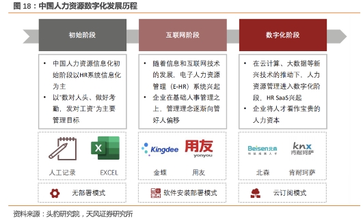 **人力资源信息化经历了三个发展阶段,目前仍处于数字化阶段初期。据头豹研究院的调查显示,最早**的人力资源数字化以HR系统信息化为主,主要解决HR事务管理难题,以“数对人头、做好考勤、发对工资”为主要管理目标。随着信息和互联网技术的发展,电子人力资源管理(e-HR)系统兴起,除了能够实现信息记录外,还能够实现数据管理和统计,企业在基础人事管理之上,管理理念逐渐向“管好人”偏移。在云计算、大数据等新兴技术的推动下,人力资源管理进入数字化阶段,HR SaaS兴起,企业将人才看做宝贵的人力资本,实现人才效用**化。