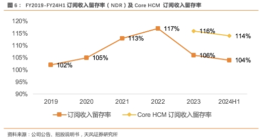 公司收入留存率优异,近五年NDR持续超过100%,其中FY2023及FY2024H1 Core HCM订阅留存率超110%。FY2024 H1公司订阅收入留存率为104%,近年NDR下滑主要系疫情的影响导致公司招聘业务不佳。公司进一步深化HCM场景,FY2023、FY2024H1 Core HCM一体化解决方案订阅留存率分别为116%、114%。