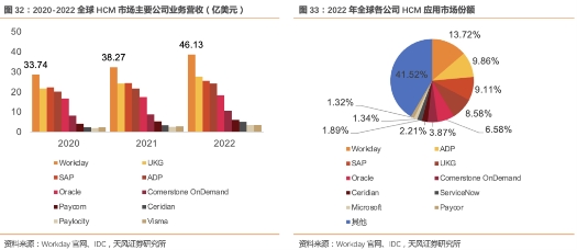 从竞争格局上看,Workday、Oracle、SAP、UKG、ADP是全球HCM应用市场份额**的HR软件公司,其中Workday也是HCM SaaS市场领军企业。根据Gartner的报告,可以看出Workday、Oracle、SAP、UKG和Ceridian处于leaders区间,是**秀的云端中大型企业HCM 云软件提供商,随后有ADP、Cornerstone和Infor等公司。从份额上看,全球HCM应用市场前五大供应商为Workday、ADP、SAP、UKG、Oracle,2022年市场总份额为47.85%,Workday占比为13.72%,ADP和SAP占比分别为9.86%、9.11%,市场集中度较高;若聚焦到云端HCM SaaS市场,市场集中度更高,前五大供应商市场份额为63.5%,Workday占主要市场份额,占比为18%。我们认为云端产品更加标准化,带来了集中度的进一步提升。
