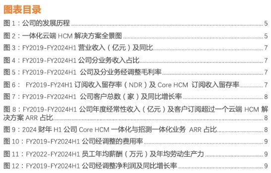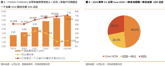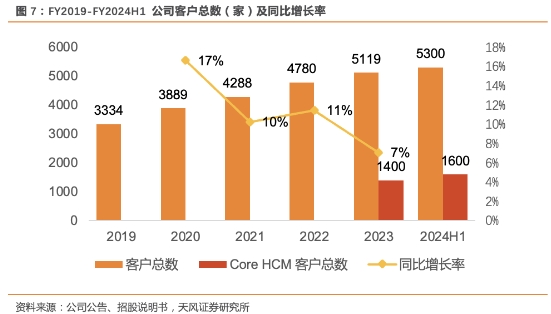 高续费率带来客户数量持续稳健增长。FY2019-FY2024H1公司客户总数由3334家增长至5300家, 增长率达59%;其中FY2023、FY2024H1 Core HCM客户数分别为1400、1600家。FY24H1客户总数增长主要系公司深耕一体化HCM场景,Core HCM与招测一体化业务的稳健增长。
