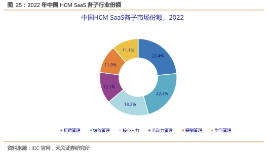 在经济乏力的时候,Core-HR和绩效管理呈现出高于整体HCM市场增速的特性,逆周期属性明显。根据IDC的数据,从2022年的市场份额来看,招聘和企业绩效SaaS市场份额占比**,其中招聘SaaS市场份额为23.4%,绩效管理SaaS市场份额为22.3%。从各个市场的增速来看,Core HCM和绩效管理SaaS市场增速最快,分别为29.5%和29.1%,高于整体HCM SaaS整体增速。我们认为,经济增速放缓时期,企业更加注重员工管理,HCM有助于实现人力资源运营调配的**解,实现资源价值的充分发挥。
