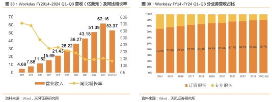 Workday近十年总营收及订阅服务营收持续高速增长,CAGR达33.3%。FY2023收入为62.16亿美元,较FY2014增长1225%;其中订阅服务为营收主要构成部分,FY14-FY2023订阅服务收入由3.54亿美元增长至55.67美元,营收占比由75.5%增长至89.6%;FY24Q3订阅收入为16.9亿美元,同比增长18.1%,年订阅收入积压为60.5亿美元,同比增长21.9%,主要系公司业务的**性以及市场对云端财务和HCM服务的持续的采用;根据Workday FY24Q3报告,企业软件行业预计打开1420亿美元的市场,其中HCM市场规模约为580亿美元,公司拥有超过5000名的Core HCM客户。