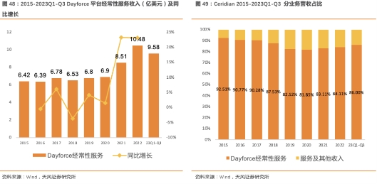 Ceridian Dayforce平台经常性收入近两年增长显著,营收占比趋于稳定。Dayforce平台2021年、2022年经常性收入分别为8.51亿美元、10.48亿美元,同比增长分别为23.3%、23.1%,两年营收占比合计均约为84%左右;2023年Q3公司总收入为3.78亿美元,同比增长19.6%;Dayforce平台经常性收入为2.8亿美元,同比增长34.6%,主要系Dayforce平台客户群体的加速增长。