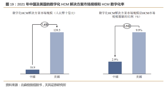 现阶段**HCM市场的数字化程度较低,尽管**已实现与美国基本相当的互联网渗透率,但**HCM市场的数字化程度仍远低于美国。根据灼识咨询,2021年**HCM数字化率(按数字化HCM解决方案市场规模/HCM市场规模总额计算)仅为2.9%,远低于美国的9.9%。落后的数字化普及程度与企业对HCM解决方案日益增强的需求结合,意味着数字化HCM解决方案市场存在可观的发展空间。