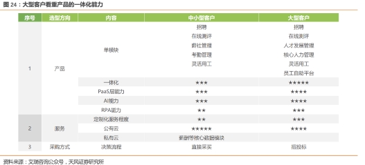 客户尤其是大型客户更看重一体化产品能力。一体化大型企业组织架构复杂、人员数量多,需要的产品模块更为**,选择单一模块产品会涉及到多模块之间的数据和信息打通,为企业带来额外的交付工作,因此通常选择一体化产品。与此同时,大型客户对于PaaS平台定制化快速交付能力、AI能力、RPA能力的需求也更为迫切。为了更好地评估产品和**采购成本,大型企业的选型决策链从原来的业务对接直接采买已经转为了招投标流程。
