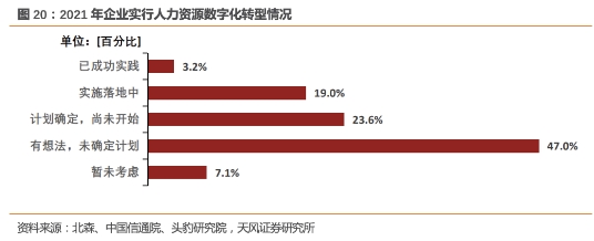 大量企业仍未进行人力资源数字化转型,渗透率空间大。根据头豹研究院《2021**人力资源管理年度观察报告》中的调研数据显示,截至2021年**有超过9成企业考虑推行人力资源数字化,但仅22.2%的企业已经开始了人力资源数字化实践,仍有77.8%的企业尚未开始人力资源数字化转型,其中有23.6%的企业有明确的计划,剩余企业处于有想法但未确定计划甚至暂未考虑的状态。