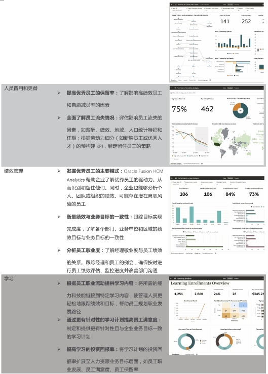 Oracle Fusion HCM Analytics是针对Oracle Cloud HCM预购建的云原生解决方案,可帮助人力资源专业人员获得现成的劳动力洞察,以改善员工流失和保留率、人才招聘和管理、薪酬、员工多元化等方面的决策。