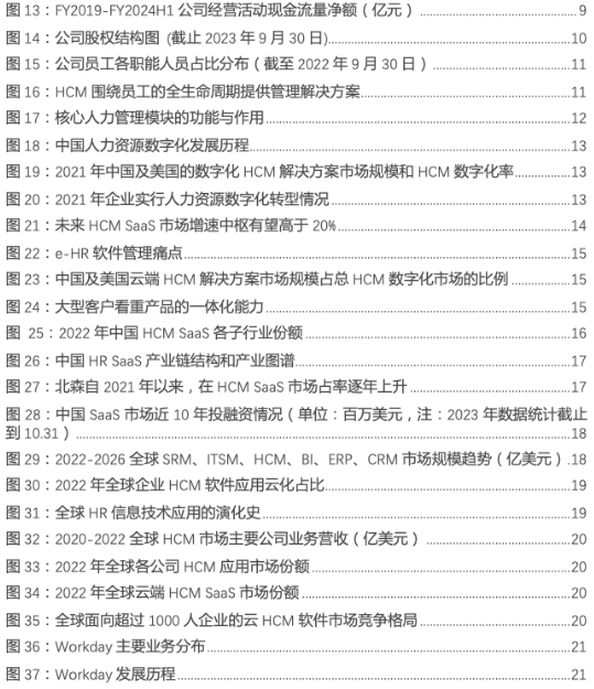 在PaaS的基础上,北森提供整套云原生、标准化的HCM解决方案,涵盖员工全生命周期的多种客户使用场景,从招聘到离职至退休,使公司的客户能有效招聘、评估、管理、发展及挽留人才。具体来看,公司HCM解决方案的主要产品包括招聘云、测评云、核心人力解决方案(人事云、薪酬云、假勤云)、绩效云、继任云、学习云、人力资源数据分析解决方案。截至2022年9月30日,公司凭借**产品组合的HCM解决方案,满足不同行业客户的共同HCM需求,解决特定行业客户的痛点,公司的客户包括科技、房地产、金融服务以及汽车和制造业行业中绝大部分排名前十的企业。公司通过快速的产品迭代周期及每周推出的HCM解决方案的软件更新,使客户能够在他们的运营环境中应对技术创新及变化。