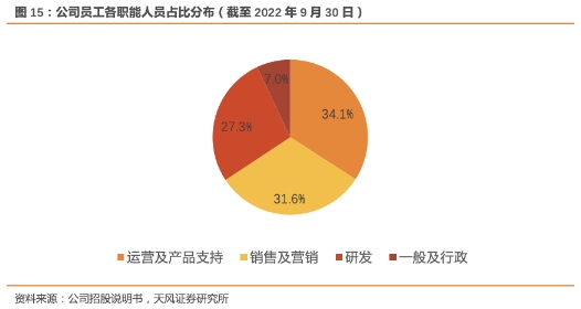 公司已经开始控制企业人数,提质增效。FY24H1公司员工人数为1901人,在2023财年企业人数为2295人。截至2022年9月30日(FY2023H1),37%全职员工在北京工作,63%位于其他城市工作。其中运营及产品支持、销售及营销、研发、一般及行政员工占比分别为34.1%、31.6%、27.3%、7.0%。