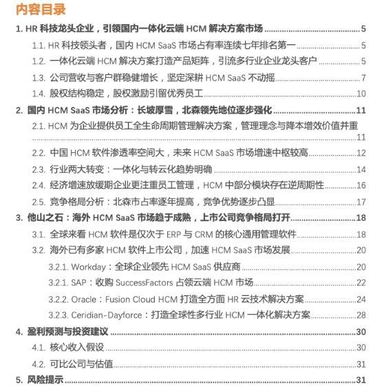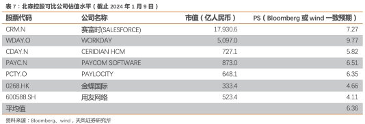 (4)跨市场选择可比公司的风险:由于A股与港股中没有太多属性接近的公司,因此我们选择了美股市场的可比公司,若美股可比公司估值调整,可能对北森的估值逻辑产生影响。