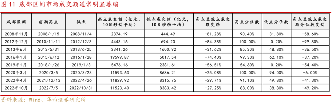 近期市场交投清淡,两市日成交数次触及7000亿左右的冰点。复盘历史,历次底部区间,市场成交额通常较前期高点萎缩25%以上,近三年分位数通常较前期高点萎缩30%以上。2008年、2012年和2016年底部成交额回落幅度均超过70%,2012年和2019年底部成交额分位数几乎位于三年**。
