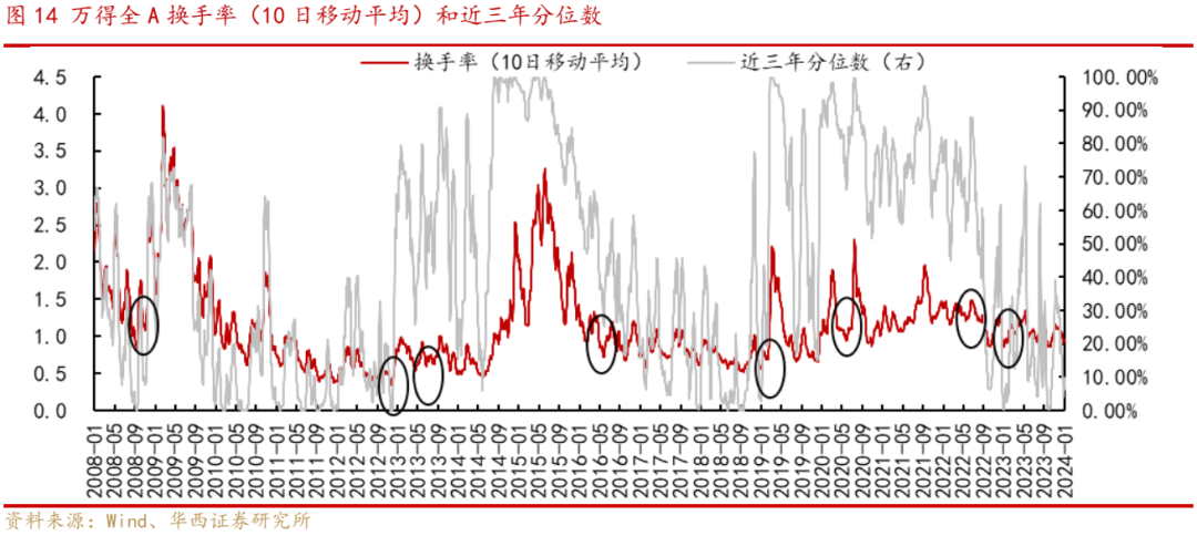 从换手率来看,历次底部区间市场换手率分位数降幅通常较前期高点有明显回落。当前来看,2023年12月底A股换手率(MA10)回落至0.9%,位于近三年4%分位,分位数较前期高点回落43%,与历次底部特征较符合。