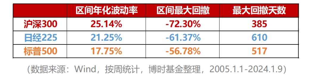 2005年以来,沪深300指数年化波动率为25.14%,期间**回撤为-72.3%,均高于日经225及标普500指数。而**回撤天数来看,A股也比其他两个指数来得时间更短。这意味着A股的波动性更强,下跌时也“更急更剧烈”。