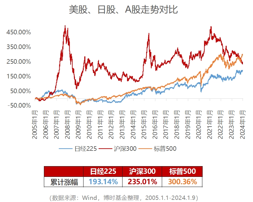 如果拉长时间,对比2005年以来标普500、日经225、沪深300等三个指数的走势,其实A股表现并不差。沪深300指数累计上涨235.01%,优于日经225指数的193.14%,弱于标普500的300.36%。