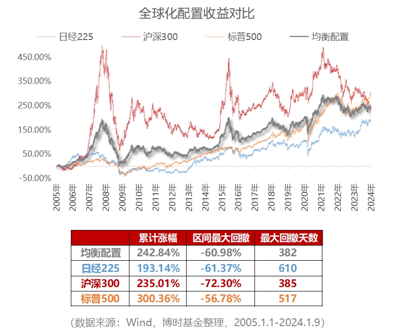 以刚刚提到的日经225、标普500、沪深300指数为例,假设将资金均衡配置到这三类指数中,累计涨幅表现同样出色,而在**回撤的风险控制上也会更好。