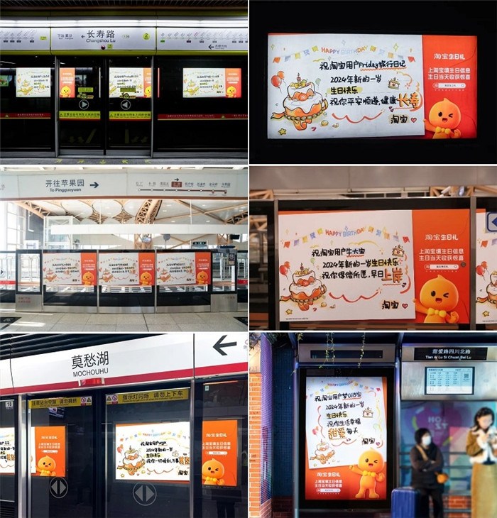 先是为1月1日生日礼上线当天的寿星们送上特别的祝福仪式——为此甄选了**各地的特殊站点打造线下祝福活动,从长寿路、上岸站再到莫愁湖,博大的汉字文化背后,是淘宝独树一帜的巧妙构思,这些饱含祝福意愿的站点,是对媒介创新的一次巧妙应用。也是与寿星们的一次独有互动。