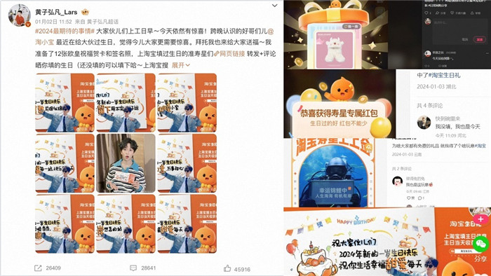 事实上,在此前的跨年晚会上,淘宝就已联动黄子弘凡将跨年晚会节目中抽取的水晶鞋,送到了1月1日过生日的用户手中。