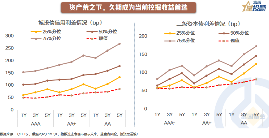 对于投资而言,行为的背后体现的**是收益挖掘的逻辑。当前利率债和中高**信用债的到期收益率水平,已经随着货币宽松和配置力量的追求降至偏低的位置。从下图可以看到,城投债和二级资本债的信用利差已经比历史上75%的时间还要低。因此,需要做进一步的收益挖掘。而从具体的策略来看,主要在于两点:一是,拉长久期,通过久期放大潜在的收益,当然同时也在承担潜在较大的风险;二是,信用下沉,通过承担更多的信用风险来享有更高的票息收益。但不同的环境下,策略的适应性是不一样的。当前而言,基本面还在弱修复的状态中,利率债长端的定价仍有支撑,而信用利差已经压制到极致时刻,信用下沉的性价比不如拉长久期。