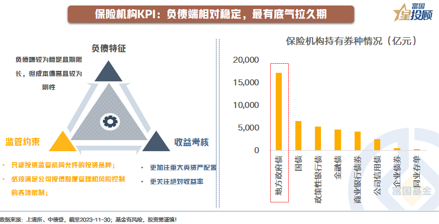 保险机构负债端较为稳定且期限长,其债券投资的核心原则是资产负债匹配。因为其负债久期较长,配债需求一般集中在长端。从收益考核来看,偏**收益考核,因此会更关注**收益率。落实到持仓上,以利率债为主,超长久期地方债能较好地匹配保险机构的负债端久期。这也是为何在本轮行情中,保险机构大幅购买20年以上期限利率债的核心原因。