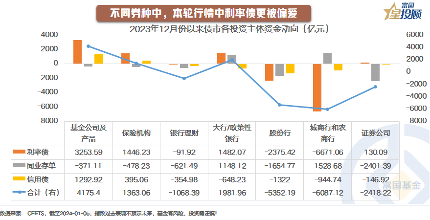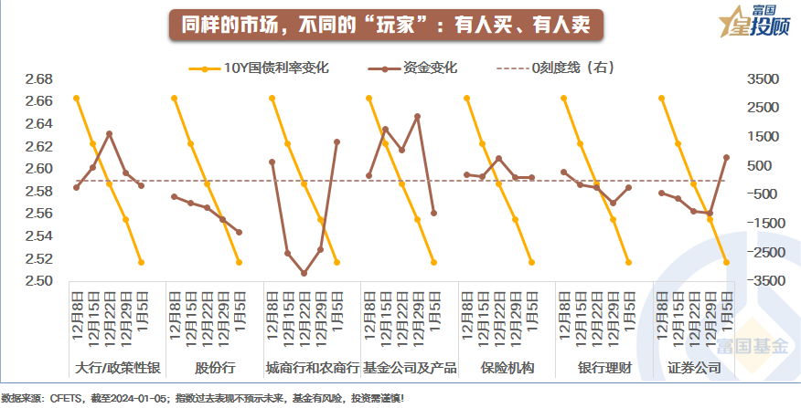 同样的市场,不同的“玩家”。机构投资者是债券市场主要的投资主体,大多数普通投资者都是间接参与其中。从2023年12月以来的资金流向看,不同的“玩家”行为差异较大。股份银行一直在卖债券,国有大行以及政策性银行月初小幅卖出,后面逐渐买入;城商行和农商行以及证券公司前期整体大幅卖出,近期开始买入;保险机构一直都是保持积极的买入;银行理财前期小幅买入,后期小幅卖出;基金公司及产品前期一直保持积极买入的态势,最近一周有**幅度卖出。