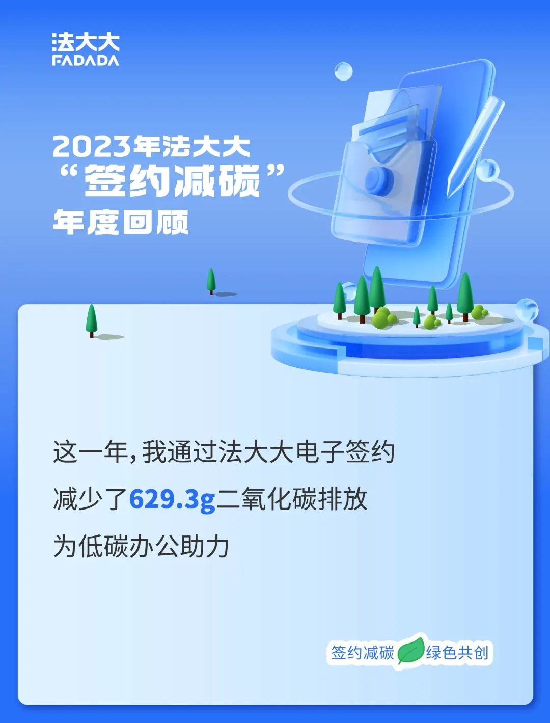 根据2023年度《签约减碳与低碳办公**》显示,在签约环节通过电子签替代纸质签约,截至2023年,法大大平台累计合同签署量已超过83亿,累计减少超147万吨的二氧化碳排放,相当于2508平方公里森林的固碳量。