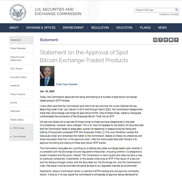 美国证交会(SEC)主席根斯勒在SEC网站发布了关于批准比特币现货ETF的声明之后。紧接着表示,尽管我们在周三批准了一些比特币现货ETF的上市和交易,但我们并未批准或认可比特币。比特币是一种投机性、波动性较大的资产。比特币现货ETF的获批将带来更多监管。