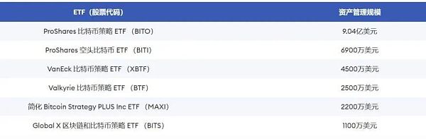 此后美国陆续上市了多只比特币期货ETF,包括ProShares Bitcoin Strategy ETF、VanEck Bitcoin Strategy ETF、Invesco Bitcoin Strategy ETF等。根据福布斯的统计,截至2023年12月,规模**的比特币期货ETF是BITO,资产规模为9.04亿美元。排名第二的BITI也是ProShares发行的,规模则小得多,只有6900万美元。