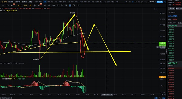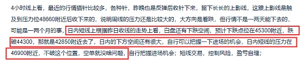 4小时线上看,大饼的这波下跌直接到了这一波40333到49027拉升的支撑位置后止跌收下影线,日内已经收出阳线,下方到支撑收针说明42100附近的支撑是有效支撑,大饼周末走反弹的机会更大,这波反弹预计会往46050-47350区间去,到达这个区间后行情再开始走下跌,行情只要是触及到这个区间收长上影线,就可以布局空单去抓更深的下跌了,大趋势是跌,但走单边的机会不大,震荡下跌,日内短线上是可以去做短线多单的布局的,支撑位置42100,不再次试探短线的多就没啥问题,自行把握进场机会,有利润自行把我出局;短线交易,控制风险,盈亏自理;