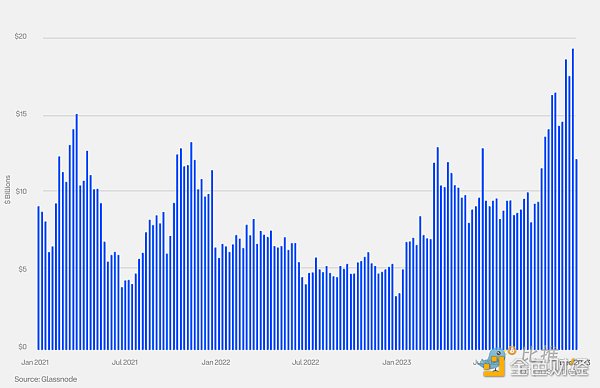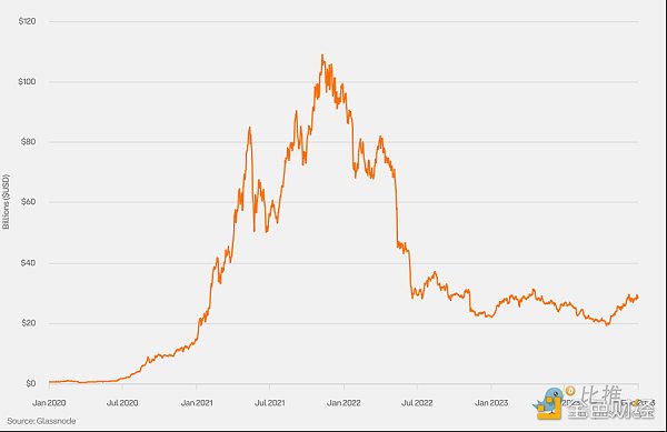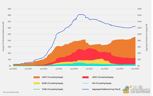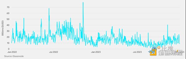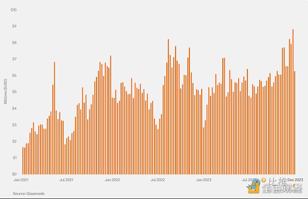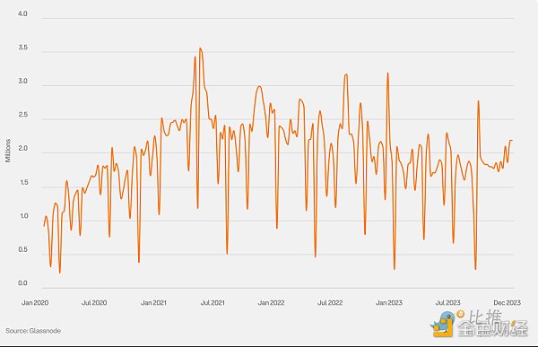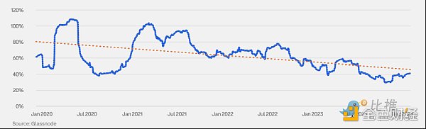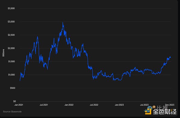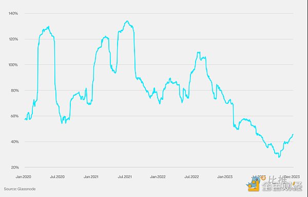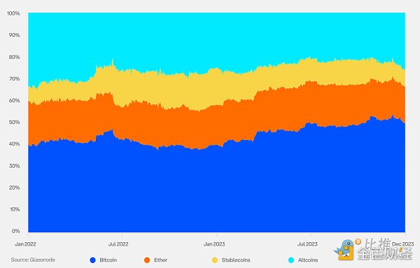 加密货币主导地位衡量的是特定加密货币的市值占所有加密货币总市值的百分比。2023年,随着市场对比特币现货ETF批准前景日益看涨,以及资金向优质资产转移,比特币的主导地位有所上升。一些市场参与者还将2024年4月的比特币减半视为潜在的价格上涨催化剂。