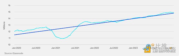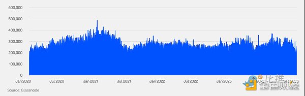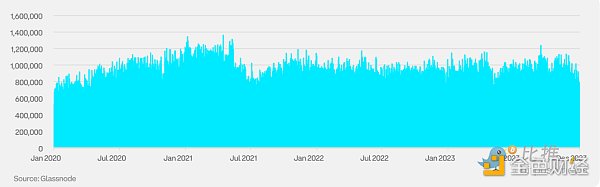 尽管活跃地址数是一个重要指标,但单个实体可以拥有多个地址,因此我们还需要关注活跃实体的数量。实体被定义为一组由同一网络实体控制的地址集群,这些地址集群是通过**启发式和Glassnode专有的聚类算法进行估算的。 在这里,“**启发式”指的是一种基于经验、知识和观察模式的复杂方法或技术,用于在信息不完整的情况下进行估计或决策。