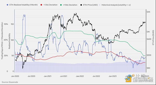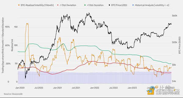 随着加密货币作为一种资产类别的成熟和机构参与的增加,波动率呈稳步下降趋势。