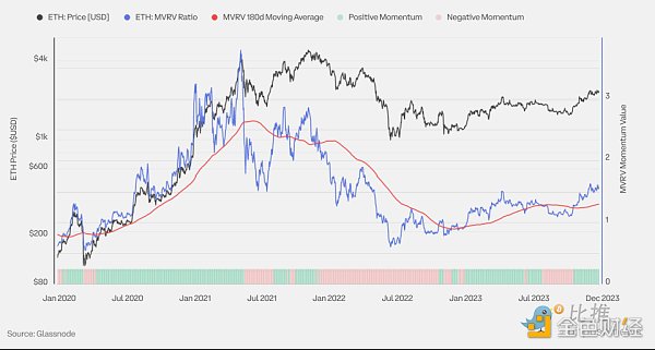 周期转折点通常以MVRV强烈突破六个月SMA为特征。强烈突破SMA上方表明有大量ETH是在当前价格以下购入的,而强烈突破下方则表明有大量ETH是在当前价格以上购入的。