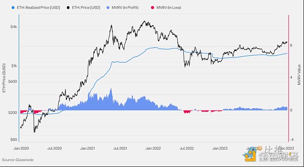 已实现价格是指加密货币供应的平均价格,按每个币种**一次在链上交易当天的价值计算;它通常被视为市场的链上成本基础。MVRV是市值与已实现价值比值的缩写,它表示市值(现货价格)与已实现价值(已实现价格)之间的比率。