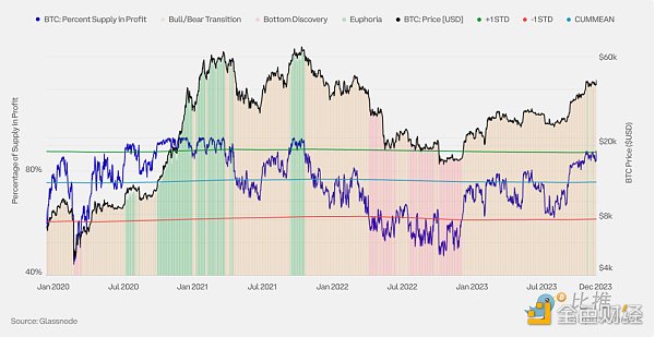 牛熊过渡期:介于底部发现期和狂热期之间的过渡时期,此时供应盈利能力更接近均衡状态(盈利供应量百分比在55%至95%之间)。