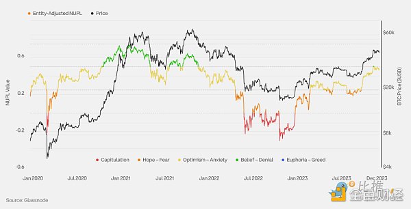 比特币实体持有调整后的净未实现盈亏(NUPL)