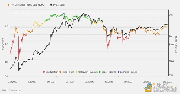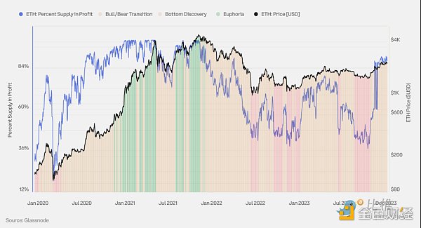 牛熊过渡阶段:这是底部发现阶段和狂热阶段之间的过渡时期,此时供应量的盈利状态更接近均衡(盈利供应量百分比介于55%和95%之间)。