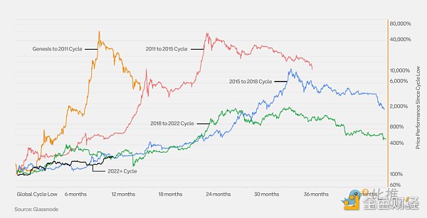 比特币已经历了四个完整的牛熊周期。在本图表中,我们可以观察到始于2022年的当前市场周期与之前周期的对比情况。