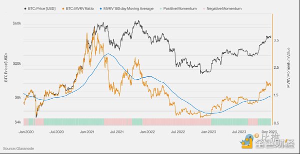 此图表展示了MVRV比率以及用作动量指标的六个月简单移动平均线(SMA)。MVRV高于六个月SMA的时期通常描述宏观市场的上升趋势,而低于该线的时期则通常描述下降趋势。