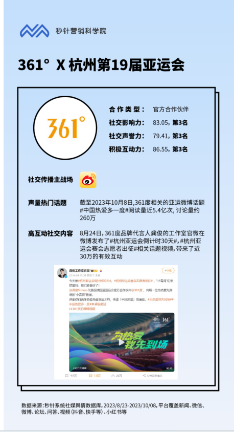 赛场之外,361°聚焦普通人亚运热爱故事,通过社媒传播,提升大众认知度,诠释民族品牌自信。截至2023年10月8日,361°微博平台亚运话题#**热爱多一度#,阅读量超过5.4亿次。361°的亚运整合营销模式取得显著成效,在秒针营销科学院发布的《2023杭州**9届亚运会赞助商社交影响力榜单》显示,361°集团位列第三位。