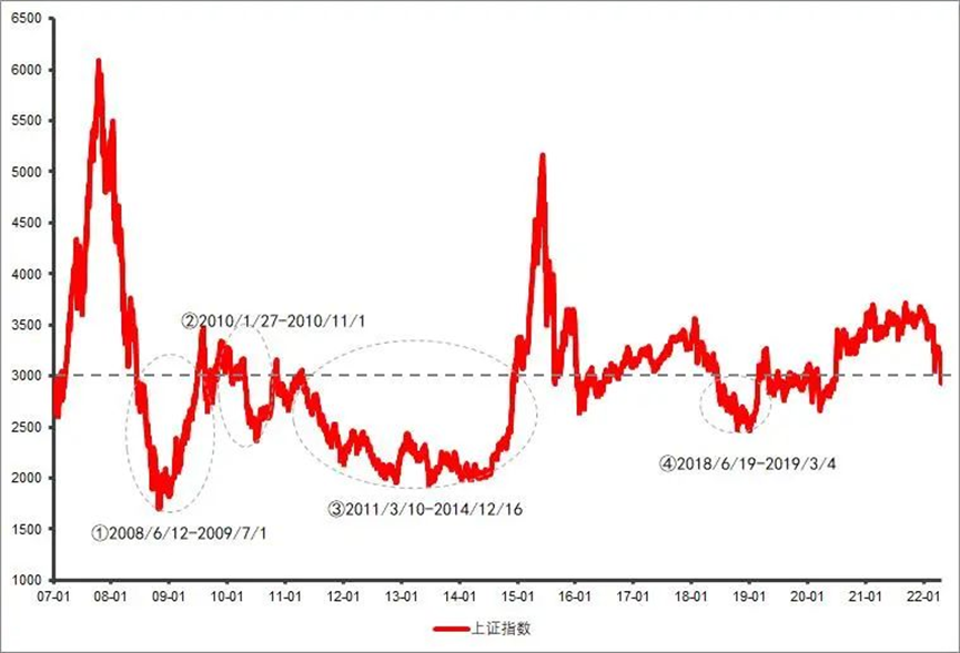 即使市场处于3000点以下的震荡磨底期,也不用过于恐慌。统计过去15年来,上证综指历次耗时较长的3000点以下的区间共有四段: