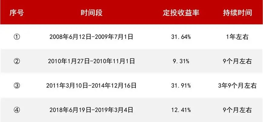 但令人惊奇的是,在这几个时间段的定投均获得正收益,而且,区间相对振幅越大的、持续越长的,定投总收益率越高。