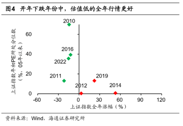 海通证券对这些年份进行分析后发现,开年下跌和全年行情关系不大,关键在于股市所处的位置和当时的政策环境,估值低位且政策氛围偏暖时,开年下跌后全年行情依旧可期。(来源:海通证券)