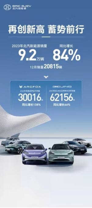 2023年,北汽蓝谷销量大幅攀升,旗下子公司北汽新能源1-12月累计销售新车92172台,同比增长84%。其中,12月,北汽新能源单月销量20815台。