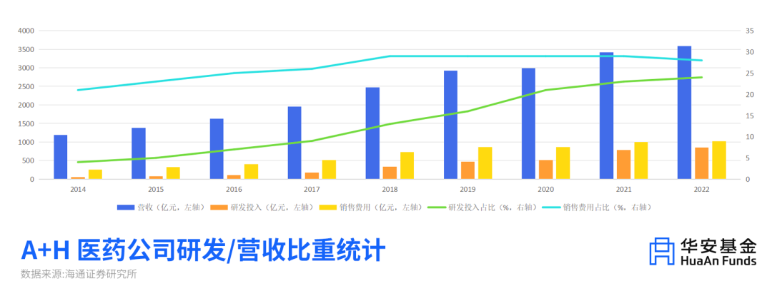 如图所示,2022年相较2018年,A H医药板块的研发费用率实现翻倍,未来医药相关研发投入仍将继续,促使含“科”量提升。