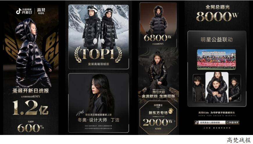 据了解,此次双十一、双十二,高梵kids电商全渠道童装同比增长150%,作为抖音1000 高端儿童羽绒服品牌,高梵kids霸榜抖音儿童休闲羽绒服爆款Top1,挑战赛话题阅读量持续发酵突破2.4亿。双十二加上“抖音圣诞上新季开新日”销售了1.3亿,成为抖音童装2023年的开新日**,在一众亲子品牌中崭露头角。