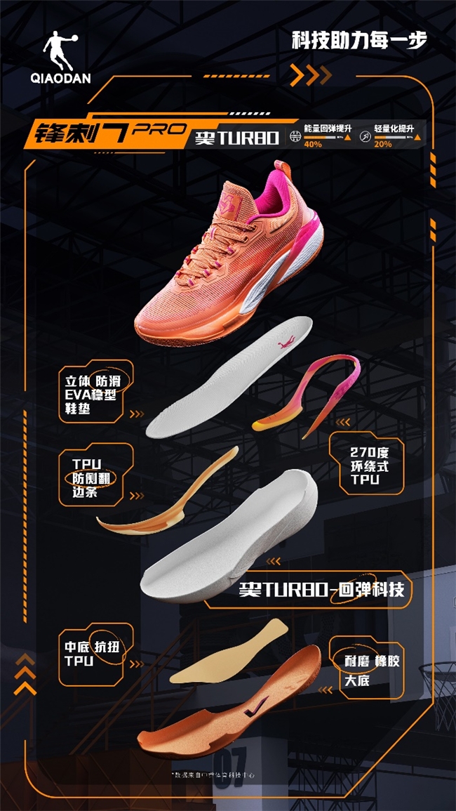 据了解,锋刺7PRO的**配色为加速橙、冷却白、尾流蓝,未来将有更多配色相继面世。同时,中底采用了看家科技——巭TURBO回弹科技。搭载全掌超临界发泡缓震材料,相较传统EVA回弹性能提升40%,轻量化则提升20%,更好地助力球员轻盈起跳。